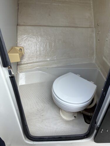 通年快適なリヤドア付キャビン: 完全密閉できるスライドドア仕様で、冬の寒風もシャットアウト。個室マリントイレも完備し、ご家族やゲストとの釣行も安心です。